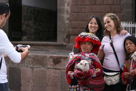Meninas cusquenãs com filhotes de llama.